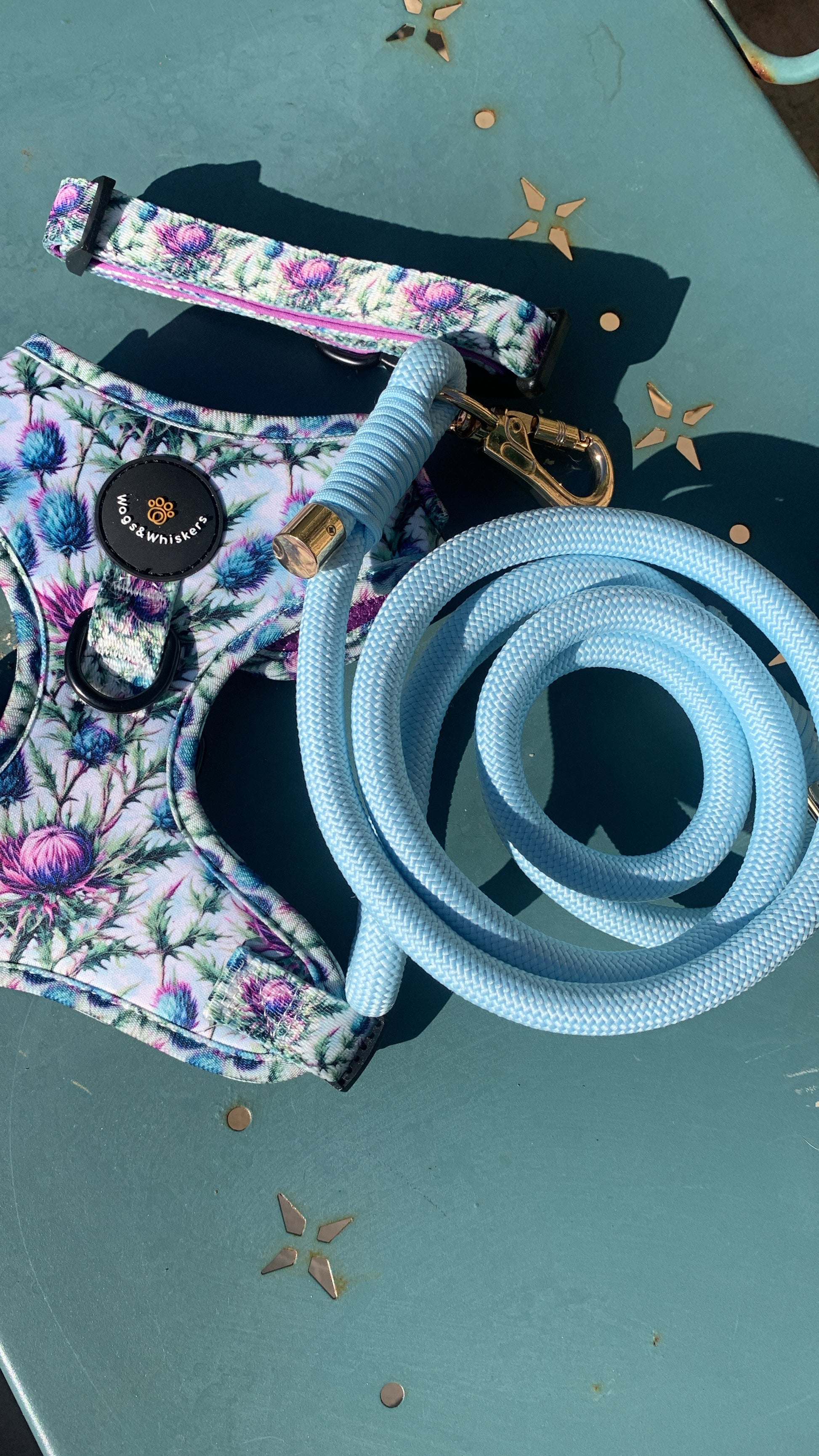 Flexible and lightweight rope dog leash in a lovely baby blue colour. Made from sturdy rope with rose gold hardware. Lockable clasp. Has leather D-ring for attachments such as poo bags, treat pouches etc. Perfect colour to compliment our Bonnie and Arran collections.