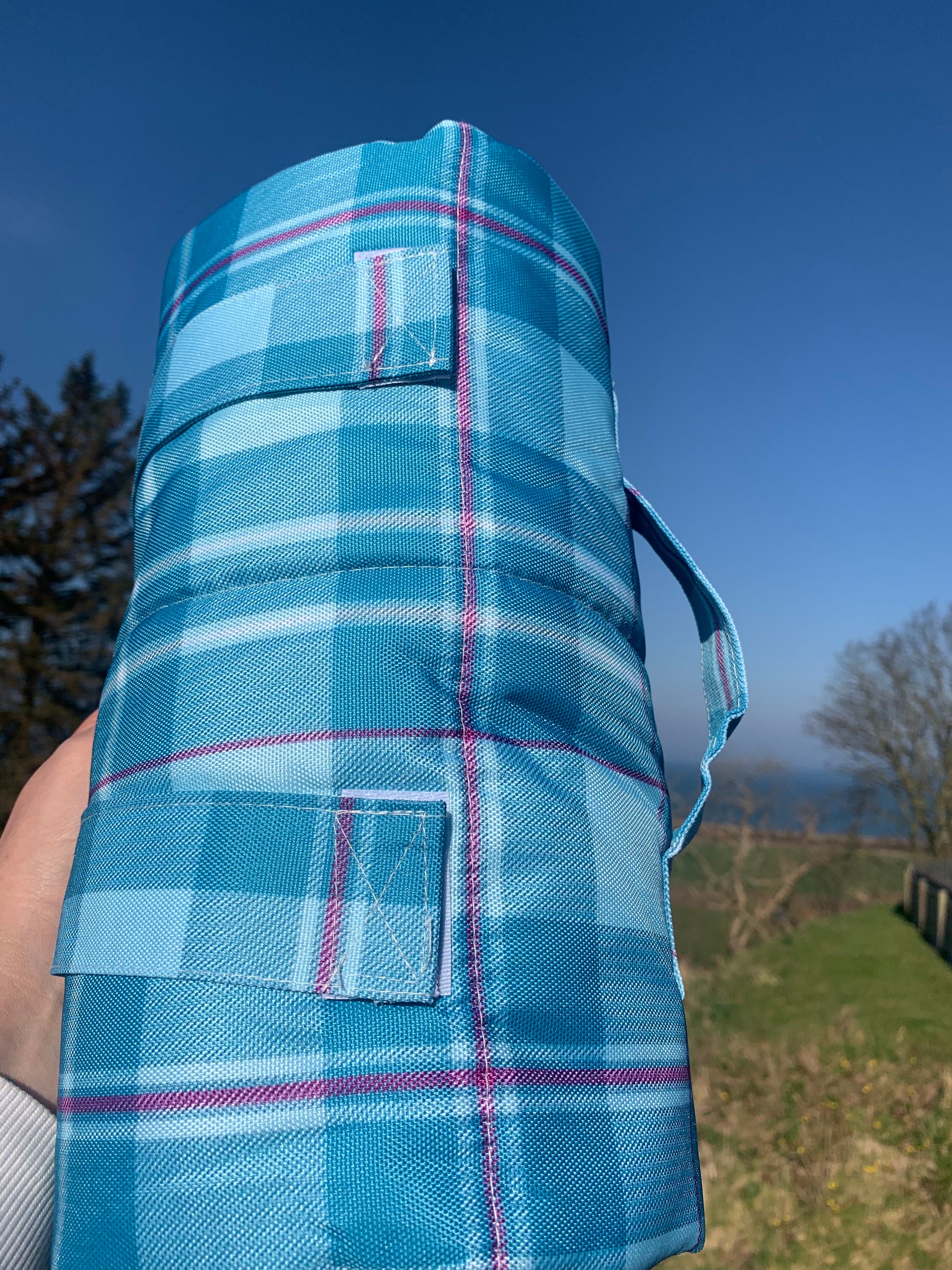 Light-weight, padded pet travel and settle mat from our gorgeous limited edition Arran collection, which is a vibrant turquoise blue tartan design. Water resistant, easy to carry and clean. Super easy to roll and secured with velcro straps. Integrated carry handle plus additional D-ring to clip-on water bowl or attach to bag.