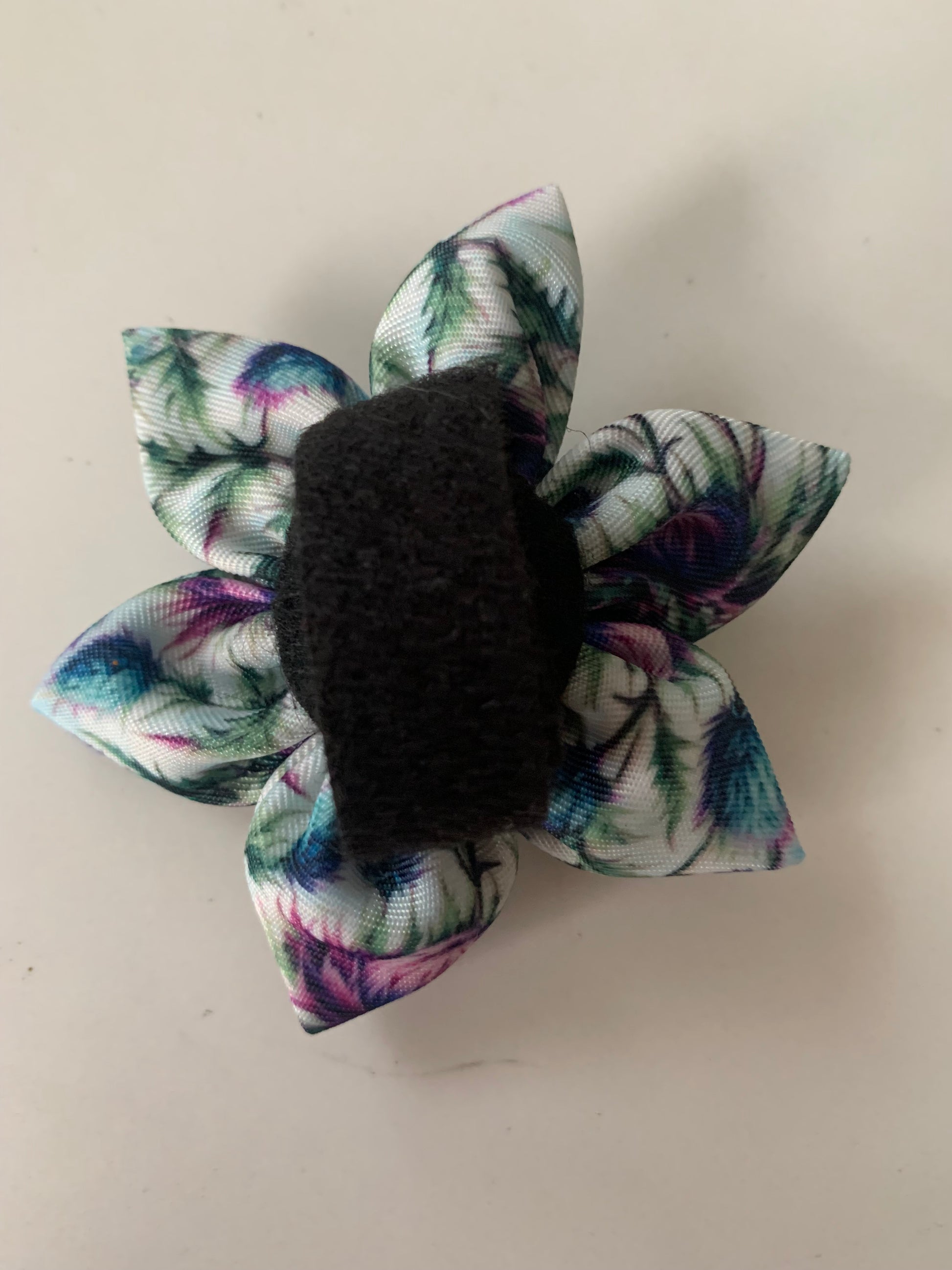 Bring some Scottish flair to your furry friend's wardrobe with this charming flower collar embellishment made in a stunning thistle fabric in gorgeous blues, pinks and purples. Part of our limited edition Bonnie collection, this unique accessory will make your pup stand out in style during daily walks, doggy dates and special occasions. Whether you love thistles, Scotland or simply adore cute details, these embellishments are a perfect choice to style your pet in a fun way.