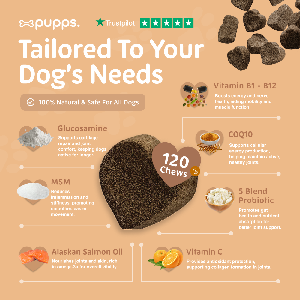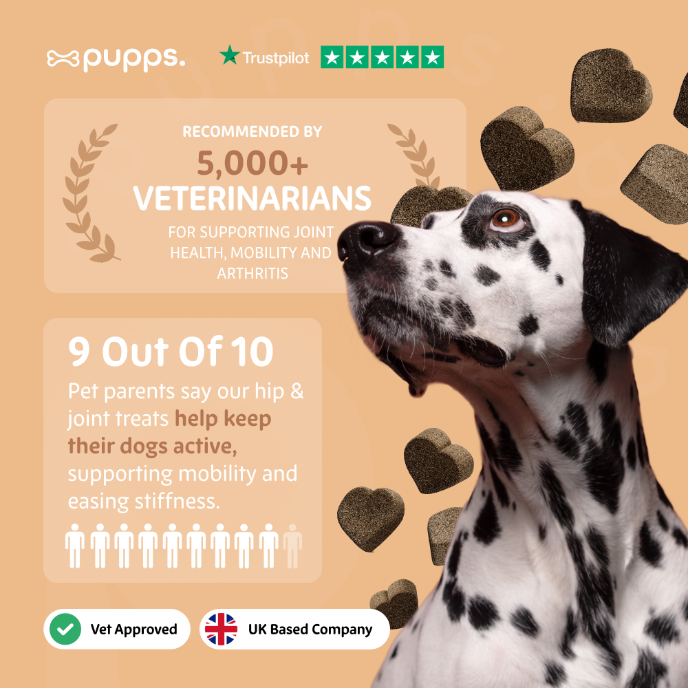 Keep your dog active with Pupps Hip & Joint Dog Treats. These treats are enriched with glucosamine, chondroitin, and MSM to support joint health and improve mobility. Ideal for older dogs or breeds prone to hip and joint issues, ensuring they stay active and pain-free.