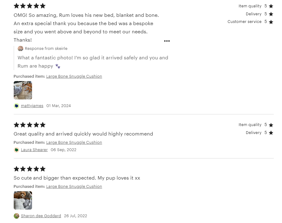 These gorgeous handmade large bone cushions are a stylish addition to your sofa, bed, dog bed … or anywhere. Measuring approximately 68cm long and 40cm wide they are perfect for you dog to snuggle up with. Available in all our fabrics (see photos)
