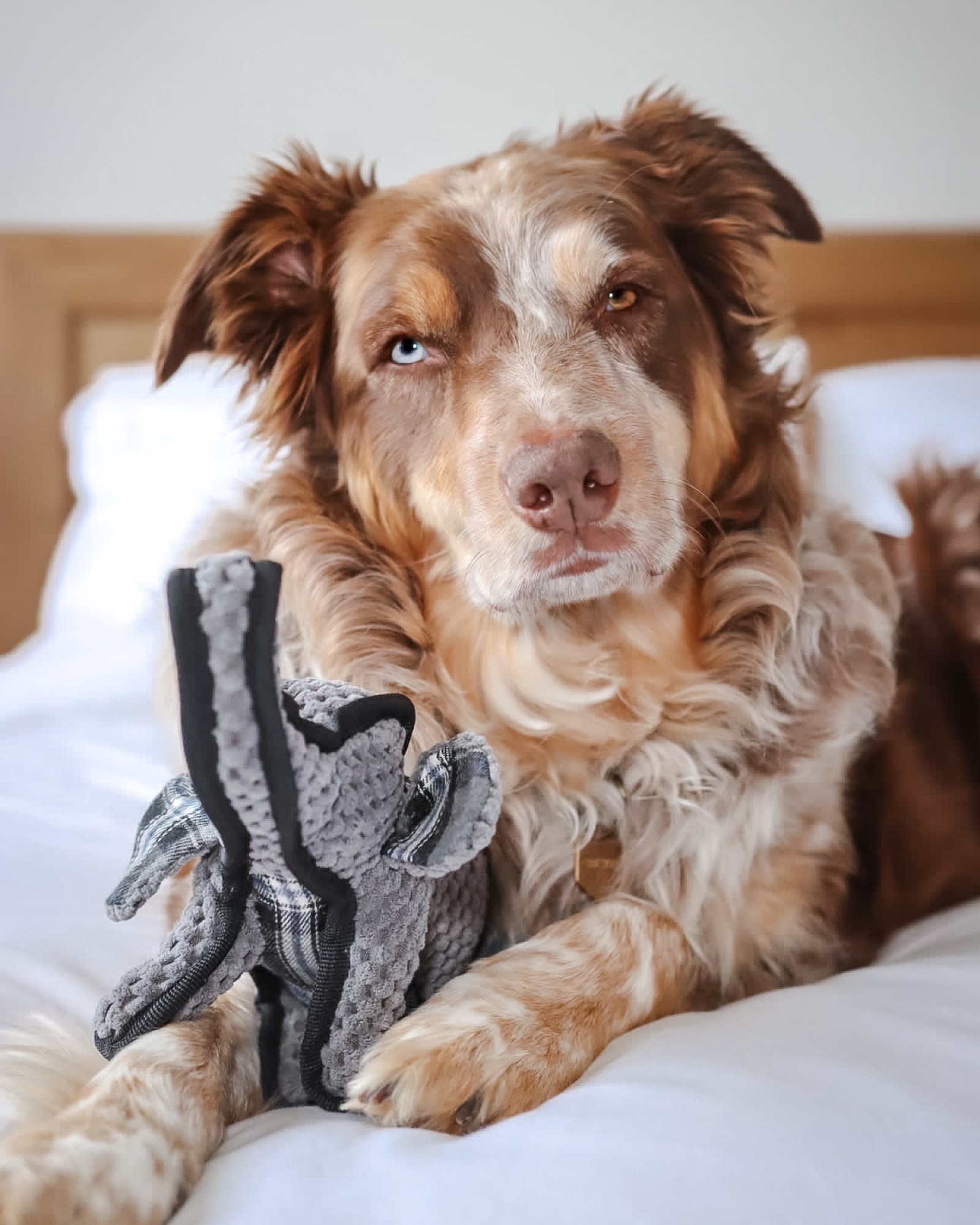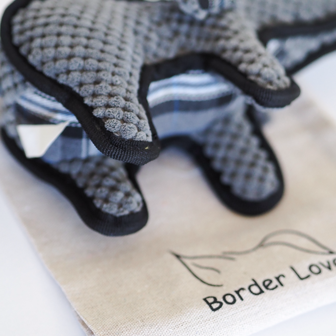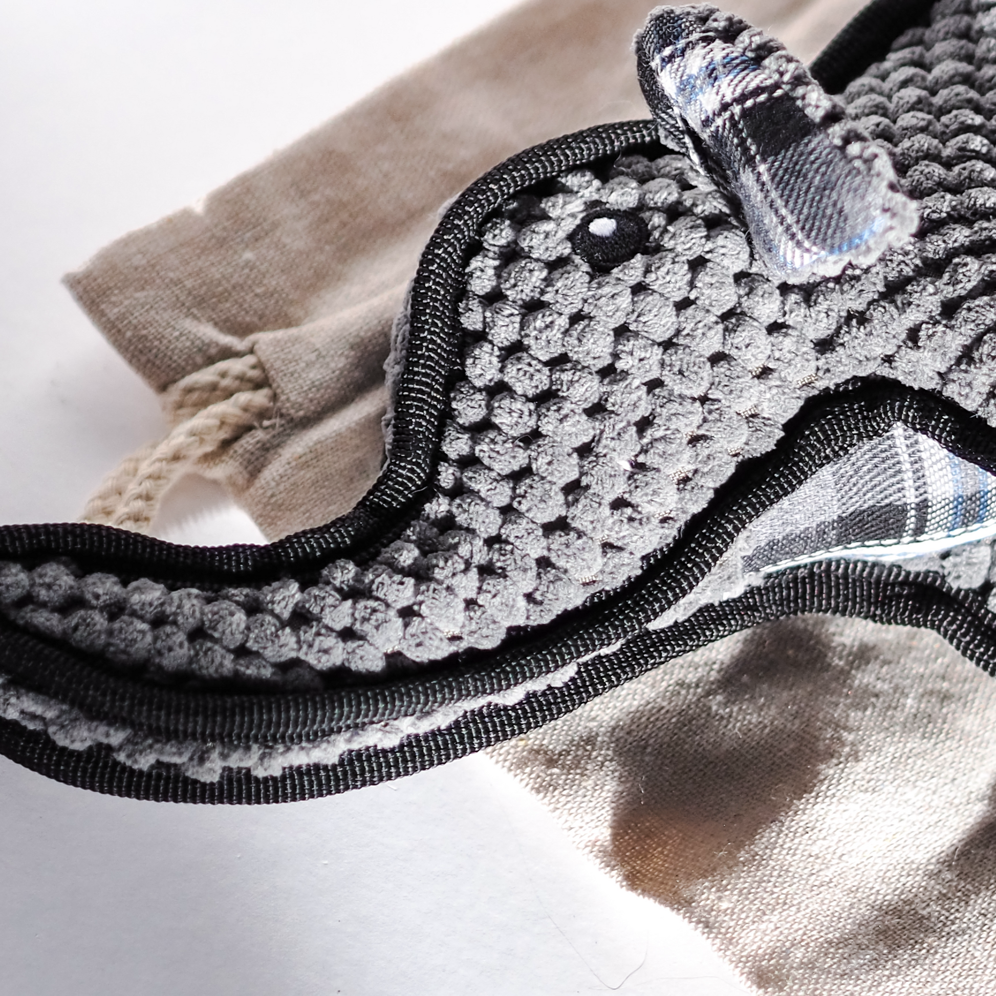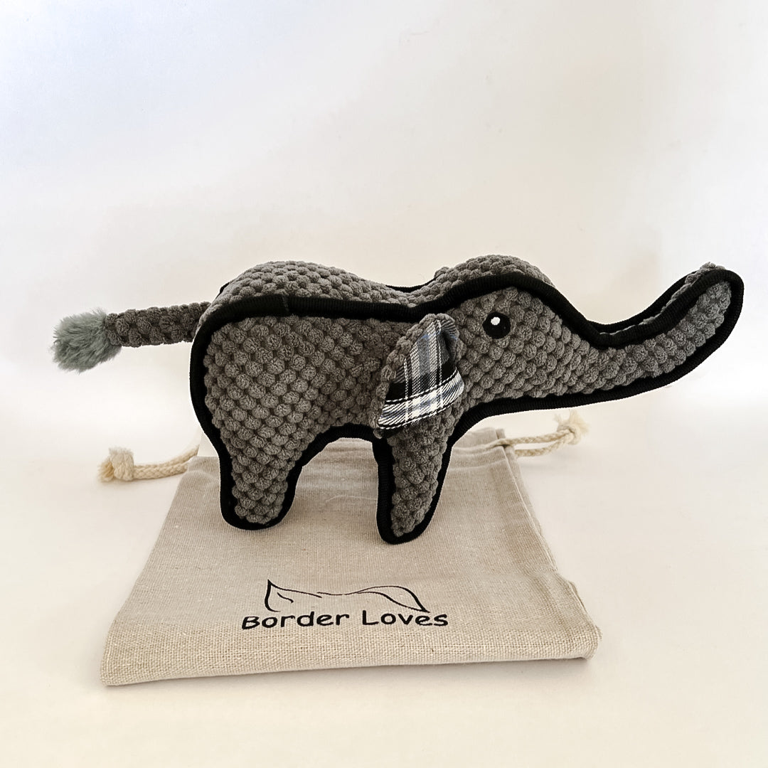 Plush and Durable - ‘Tuffy’ the Elephant Dog Toy with his soft grey fabric and tartan ears and underbelly is the ideal dog gift ~ Squeaky and stuffed with recycled cotton and with added binding for durability, he’s also packaged in our signature cotton reusable gift bag. Perfect for soft chew and supervised play.