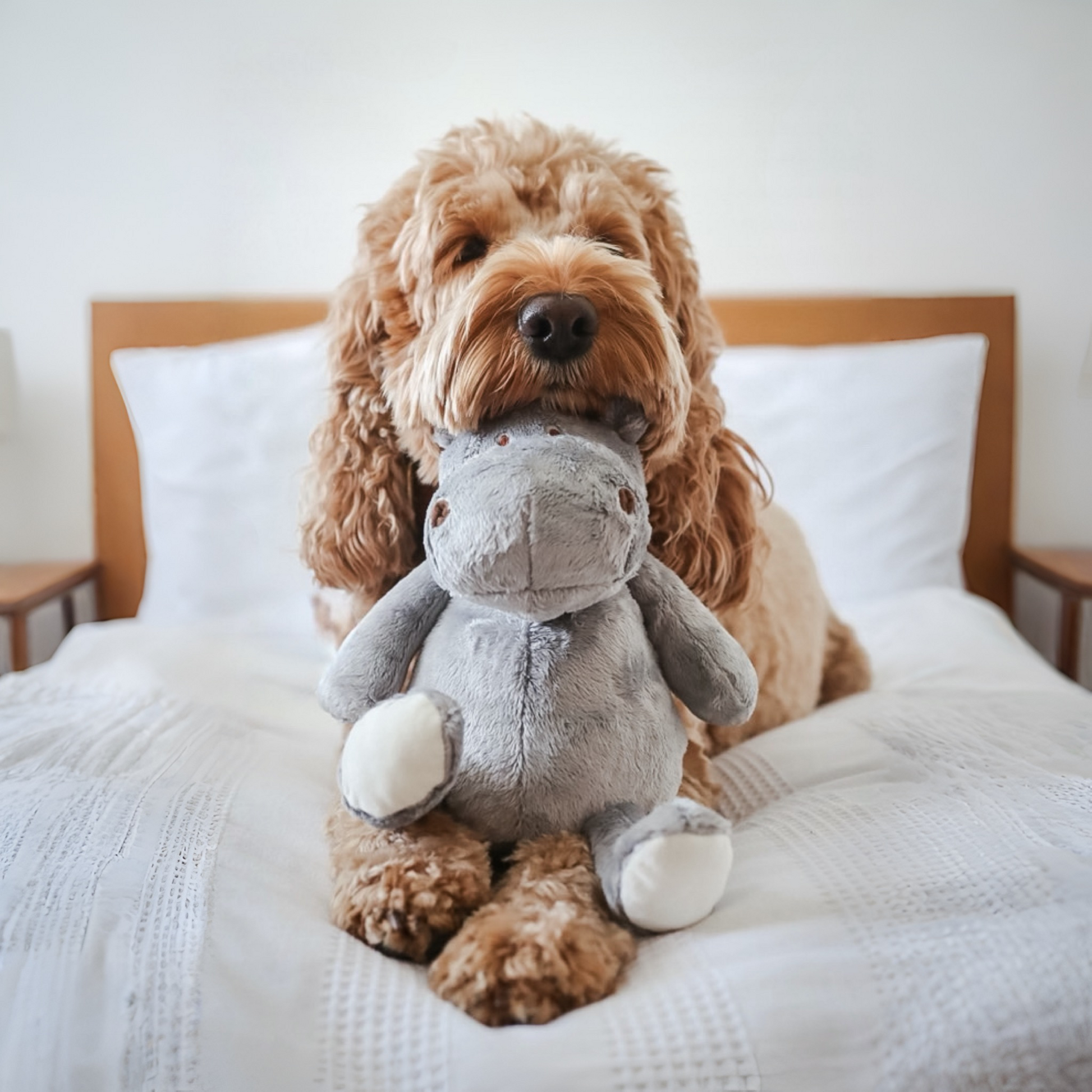 Plush Potamo the Hippo is our adorable Squeaky Dog Toy Gift that you may want to keep just for yourself! - soft plush grey with little white feet and tail he will complement your home whilst providing plushie comfort to your pet